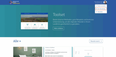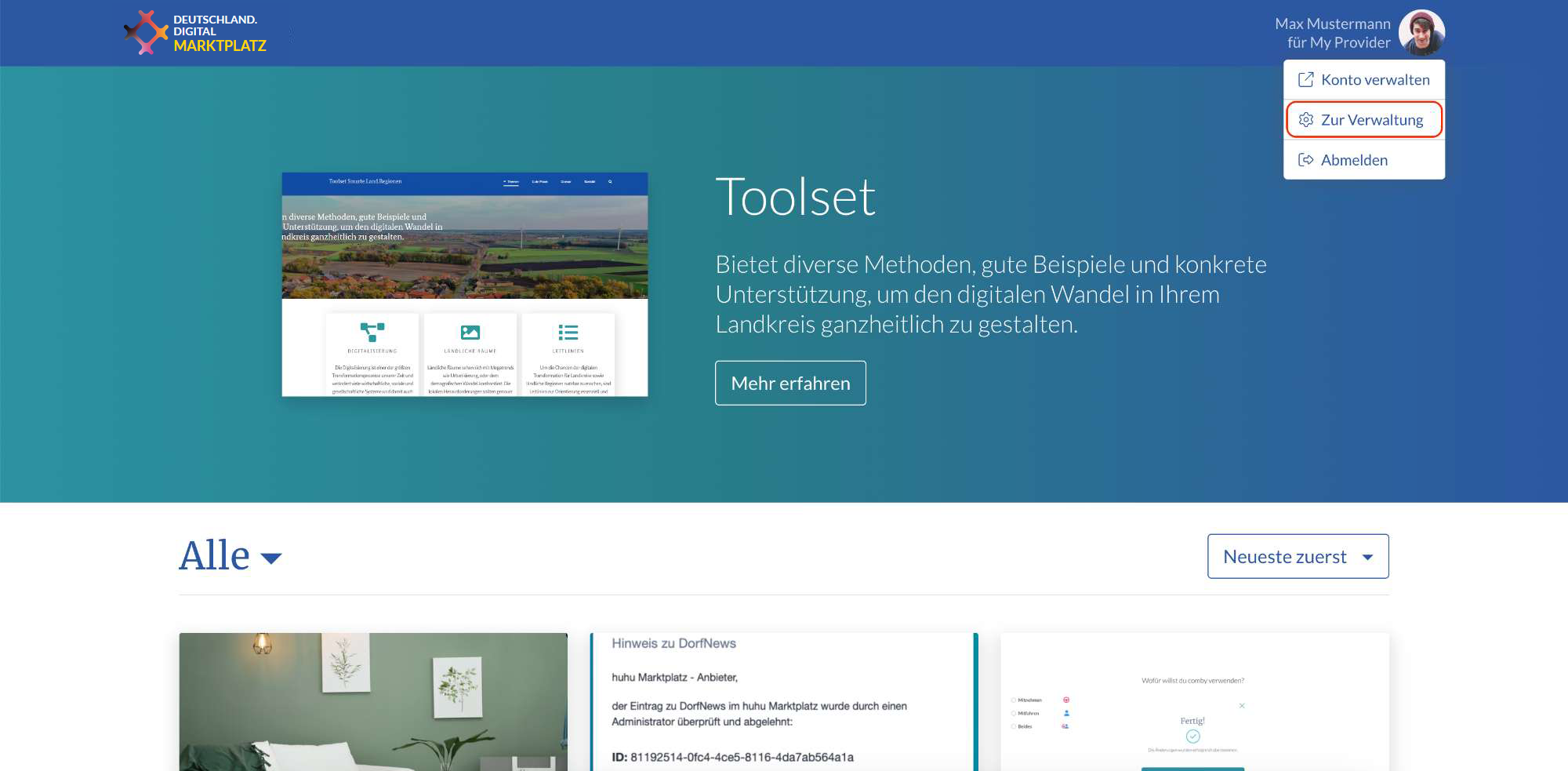 Um einen neuen Eintrag auf dem Marktplatz zu erstellen, müssen Sie registrierter Nutzer sein und einer Organisation angehören. Zunächst müssen die von der Ansicht »Marktplatz« in die Ansicht »Zur Verwaltung« wechseln. Klicken Sie hierzu auf Ihr Profilbild im rechten oberen Eck und wählen Sie dort »Zur Verwaltung«.