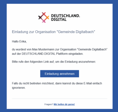 Daraufhin wird in den nächsten Tagen eine weitere E-Mail mit der Einladung zur Organisation (Unternehmen, Kommune, Verband, etc.) versendet.