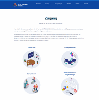 Gehen Sie zu Zugang und wählen Sie die entsprechende Kategorie aus. Dort finden Sie spezifische Informationen, wie Sie sich bei DEUTSCHLAND.DIGITAL registrieren können.